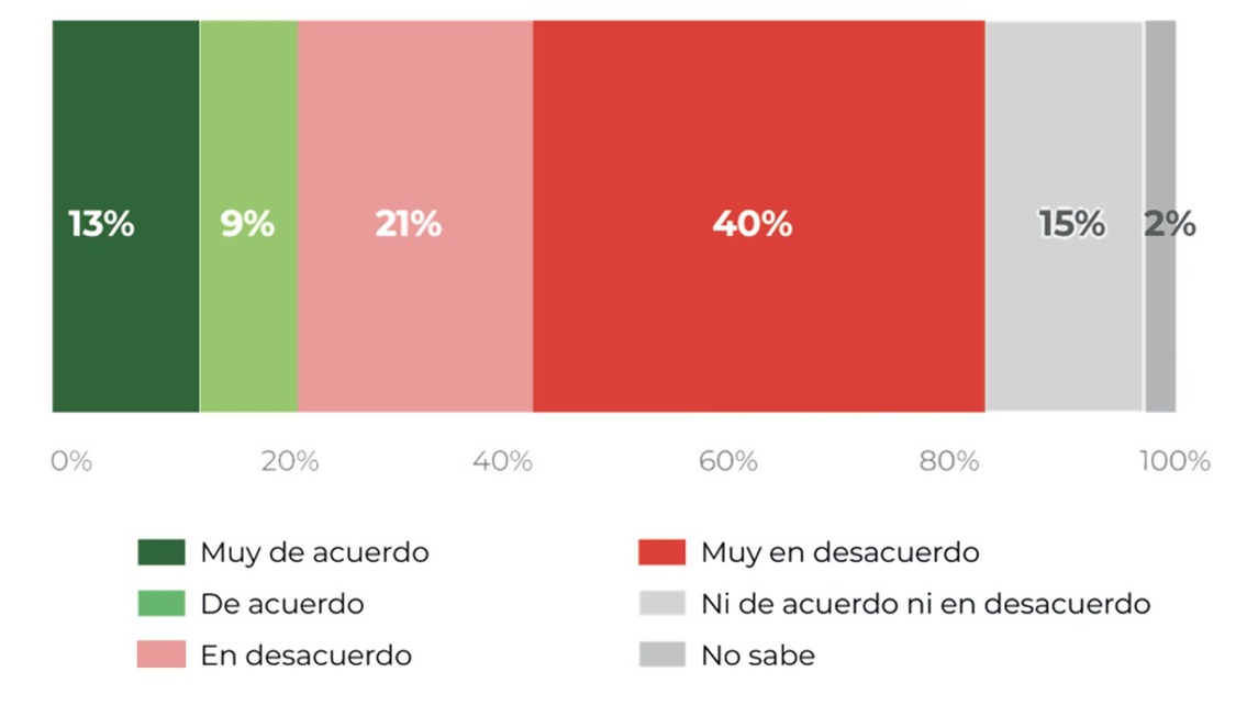 El rechazo supera ampliamente al apoyo: el 40% de los consultados se declara muy en desacuerdo con la reforma y un 21% adicional afirma estar en desacuerdo. En contraste, los niveles de acuerdo resultan considerablemente menores.